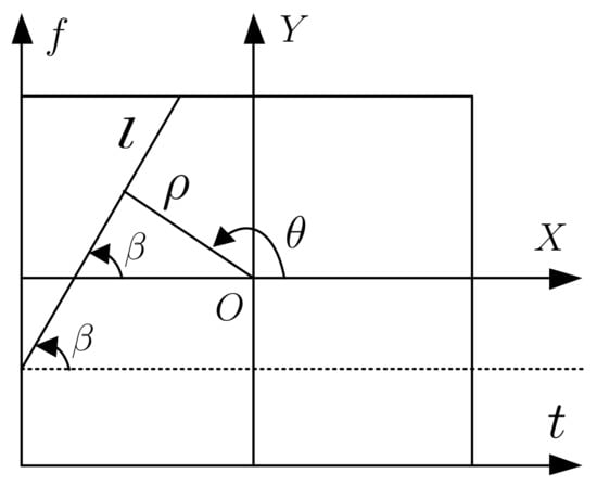 Hough transform can be used to detect the line of frequency modulation law for a given signal in the TF image space. The principle of Hough transform can be explained in Figure 4, where the center of a rectangular TF image is assumed to be the origin O of a Cartesian coordinate system XOY and the TF image size is set to be . If the position of a pixel in the TF image is represented by , then from Figure 4, it is easy to know that , . Concerning a straight line in the TF space, the norm form of the Hough transform is given as follows [15]: