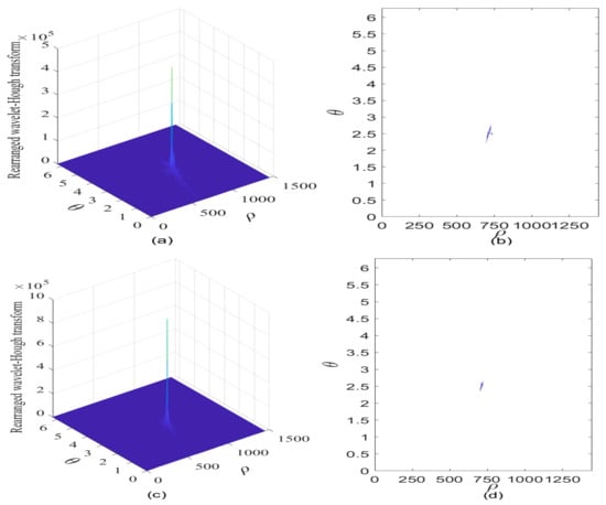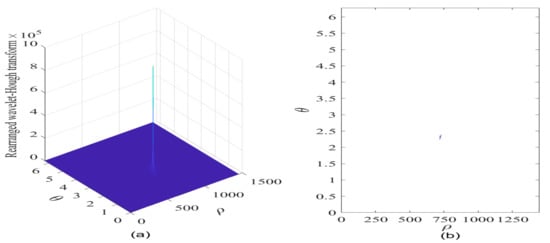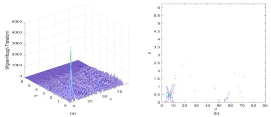 When considering the detection of the LFM interfering signal (sweep interference) by using the WVD, if the undesired cross-term is not considered, the auto-term’s energy distribution is concentrated on a straight line representing the signal’s frequency modulation law in the TF plane [15]. If the Hough transform is combined with the WVD, the problem of detecting global straight line representing the LFM interference’s frequency modulation law in the TF plane can be converted to the problem of finding the corresponding energy peak focused on a particular point in the - plane [15]. Therefore, the Wigner–Hough transform (WHT) can be formed, which is defined as [15,27]: