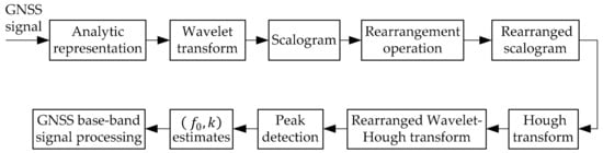 The proposed GNSS interference detection method based on RWHT is clearly explained in Figure 6. The received GNSS signal in the analytic form is wavelet-transformed, then the scalogram is calculated, which is to be redistributed by using the rearrangement to obtain rearranged scalogram. The rearranged scalogram presents improved TF aggregation property, but in low jammer-to-noise ratio (JNR )condition of GNSS interference detection, the TF energy distribution discontinuous phenomenon may occur in the TF plane; therefore, to deal with such discontinuity problem with the rearranged scalogram, the Hough transform is introduced and combined with the rearranged scalogram, theoretically, thus the RWHT can be obtained. All the points in the straight line represented by the rearranged scalogram in the TF image space will correspond to the RWHT energy peak concentrated in a determined point within the parameter space.