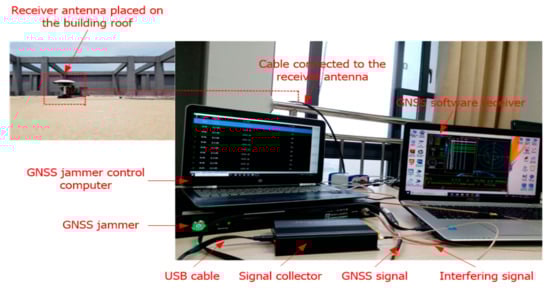 In this section, the performance of GNSS interference detection based on rearranged wavelet–Hough transform was analyzed in comparison with the traditional interference detection techniques such as WVD and WHT. The scheme of the GNSS interference detection test is illustrated in Figure 7, and the experimental setup for collecting the GPS-L1 C/A signal corrupted by interference is depicted in Figure 8. A jammer controlled by a computer was used to produce interference, which was added to the GPS L1-C/A samples collected by the GNSS software receiver, whose receiver front end was connected to the receiver antenna placed on the building roof through a cable. The combined signal was captured using a GNSS signal collector and sent to the GNSS software receiver implemented on another computer through a USB cable.