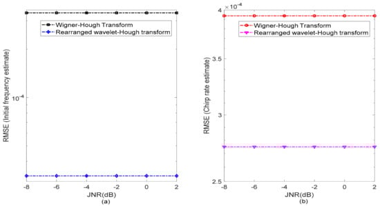 The RMSE of the estimated chirp rate and initial frequency of the sweep interference present in the received GPS L1-C/A signal by using Wigner–Hough transform and rearranged Wavelet–Hough transform, respectively. = 40 dB-Hz. (a) RMSE of the estimated initial frequency of the sweep interference; (b) RMSE of the estimated chirp rate of the sweep interference.