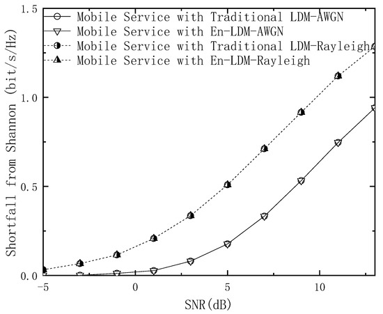 Obviously, it can be observed from Equations (18) and (19) that the spectral efficiency shortfall from Shannon for the mobile service of the traditional LDM system is equal to that of the proposed En-LDM system. Since the mobile service of the traditional LDM system occupies a higher bandwidth than the En-LDM system, the transmission capacity of the mobile service of the LDM system will be slightly higher.