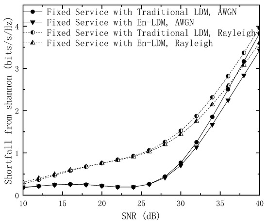 Following Equations (14) and (15), the spectral efficiency shortfall from Shannon for the fixed service of the traditional LDM and En-LDM systems are calculated as