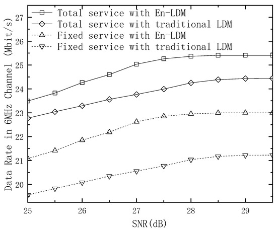 The throughput of the mobile service and fixed service of the proposed En-LDM system and traditional LDM system were simulated under the multipath channel. As shown in Figure 6, the En-LDM system provides higher channel capacity for both the overall service and the fixed service (working at high SNR) under the multipath channel. When the SNR is higher than 29 dB, the channel capacity of the fixed service in the En-LDM system is 1.77 Mbit/s higher than that of the traditional LDM system, and the channel capacity of the overall service in the En-LDM system is 0.97 Mbit/s higher than that of the traditional LDM system. In addition, we found that the channel capacity growth of the overall service of the system is less than that of the fixed service, which shows that the channel capacity of the mobile service in the En-LDM system is lower than that of the traditional LDM system. This result is consistent with the previous spectrum efficiency analysis and simulation results. The reason behind this is that the data removed by the puncturing of the fixed service occupies a small number of subcarrier transmissions of the original mobile service in the LDM. As these results show, in a typical scenario of delivering robust HDTV mobile services and high data rate UHDTV fixed services in an radio frequency (RF) channel [30], the proposed En-LDM scheme can provide more efficient spectrum usage while allowing a slight decrease in the transmission capacity for mobile service.