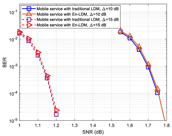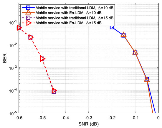The bit error rate (BER) simulations of mobile service and fixed service in the En-LDM system and traditional LDM system under the AWGN and multipath channels are performed, and the results are presented in Figure 7, Figure 8, Figure 9, Figure 10 and Figure 11, respectively.