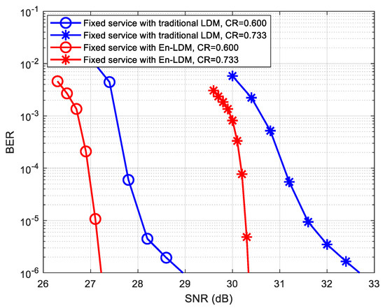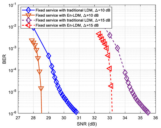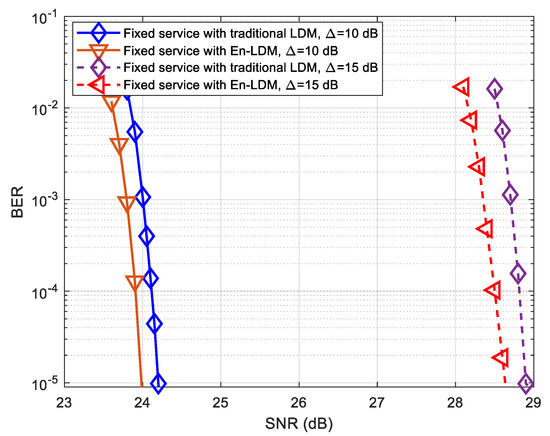 BER performance of fixed service with En-LDM and traditional LDM systems under the AWGN channel, where the injection levels were set to and 15 dB, the CL constellation was set to QPSK, the EL constellation was set to NU−64QAM, the puncturing rate of the En-LDM scheme was set to 1/13, and the LDPC code rates of CL and EL were set to 5/15 and 11/15, respectively.