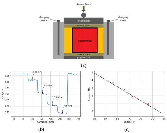 Calibration of the stress cell of SmartRock: (a) Equipment of the direct shear test; (b) Voltage signal under pressure; (c) Relationship between voltage and stress.