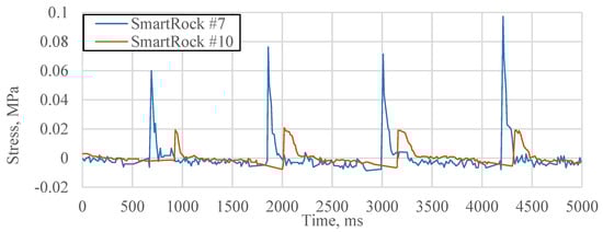 In the field pavement, the distance between the two SmartRocks is 5.5 m. A series of signals under the vehicle loads were extracted from SmartRocks #3 and #5 (Figure 6a). It is found that although there are different scenarios when the signals are very different (Figure 6b–e), the trend of individual signal is similar to the signals collected from the APT test. Most cases belong to case 1, of which both two axle loads of a vehicle were captured by two SmartRocks, and the time delay can be accurately calculated using the cross-correlation method, as shown in Figure 6b. In case 2 (Figure 6c), one of the SmartRocks (For example SmartRock #5) only captured an axle load of the vehicle, while the SmartRock #3 captured two axle loads. Case 3 (Figure 6d) shows that two SmartRocks captured one axle load, respectively. These phenomena made it difficult to determine the specific axle load that caused the corresponding peak stress and could result in theoretical errors in the case 2 and case 3. Figure 6e shows that only one SmartRock captured a vehicle load. In this case, the data were removed in the calculation because the time delay is hard to be obtained from an individual SmartRock.