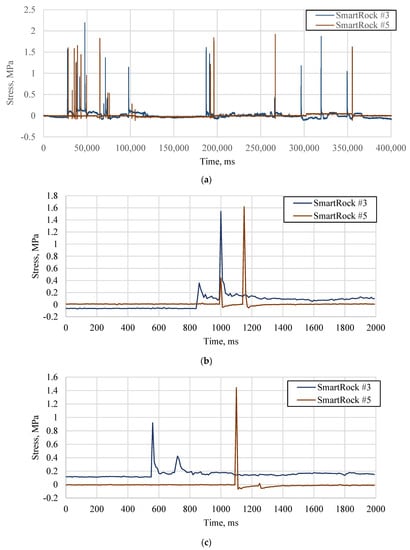 In the field, matching the collected data is more complicated due to more sophisticate traffic environment (traffic grouping, wandering, noises, etc.). Several strategies were used to solve this problem. First, only the peaks greater than the three-sigma limit were selected as the effect of vehicle loads; others were treated as noises [25]. In addition, to prevent mixing stress responses from two different vehicles selected for cross-correlation analysis, some constraints were added. If the time interval of two stress responses is greater than 1 s, it is believed that these two responses belong to two vehicles given the regular vehicle speed of 10–60 mph and the typical axle distance of 2.34 m to 4.32 m. Finally, the timestamps recorded by SmartRocks were introduced to ensure the stress signals collected by the two SmartRocks were actually caused by the same vehicle.