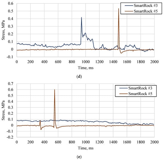 Collected Stress Signals in the Field (a) a series of stress signal; (b) case 1: two SmartRocks captured two axle loads, respectively; (c) case 2: one of the SmartRocks only captured an axle load; (d) case 3: two SmartRocks captured an axle load, respectively; (e) case 4: one of the SmartRock didn’t capture the signals.