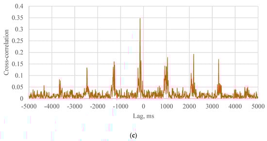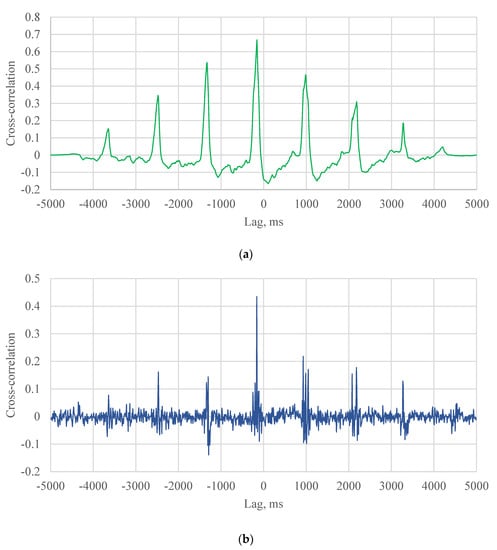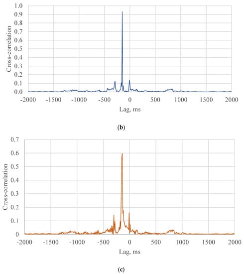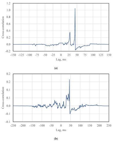 where, is the cross-correlation. and are signals. τ is the lag. From Equation (2), the cross-correlation can be calculated at different lags τ. The maximum value of the cross-correlation can be found at a certain lag τ that is the time delay between the two signals.