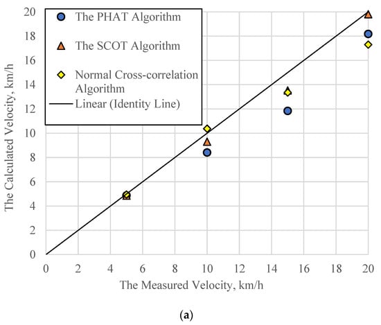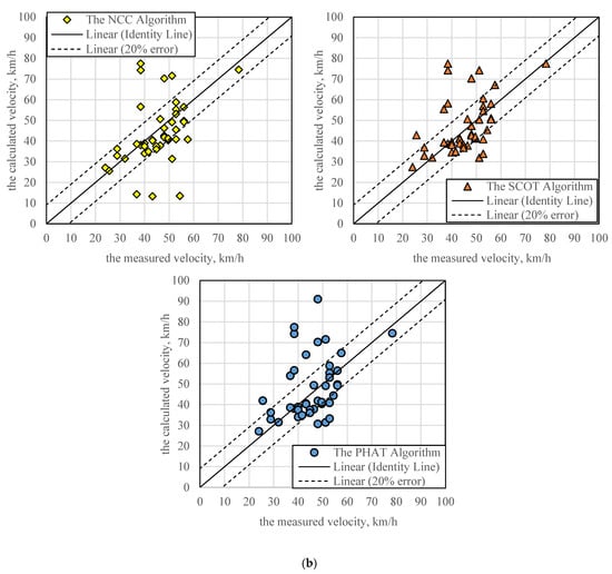 Figure 10 presents a comparison between the estimated speeds using different cross-correlation algorithms and the measured speeds, illustrated in a line of equality plot. A set of 20% error lines were also included in the figure to show the prediction quality. In general, most data points are within the 20% error lines and the three algorithms seem to give reasonable estimation for the speeds. Large errors do happen in some cases which may be related to the data capturing capability of the existing sensor setup under sophisticated traffic conditions. In addition, the SCOT algorithm has the least points beyond the 20% error zone, indicating it might be the most promising algorithm among the three. A quantitative error analysis of these three algorithms will be discussed in the next section.