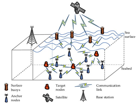 In recent years, wireless sensor networks (WSNs) have been widely used in many fields [1,2,3], such as data collection, environmental monitoring, target localization and tracking, and traffic control. One of the critical applications is the use of ocean sensor networks (OSNs) to locate ocean targets [4]. In order to achieve effective and accurate positioning, some sensor nodes that are sensitive to location indicators are usually deployed on the ocean surface or underwater, including anchor nodes and unknown nodes. It deserves to be noted that the location of some anchor nodes is fixed and pre-known, and some are mobile and equipped with the localization hardware that can provide location information. The goal is to make full use of the anchor node information to locate the target node. In this paper, buoy nodes on the ocean surface, the anchor nodes underwater with the known position, and unknown target nodes are considered in OSNs where they can communicate using the acoustic signal [5,6]. The whole system model for OSNs is depicted in Figure 1.