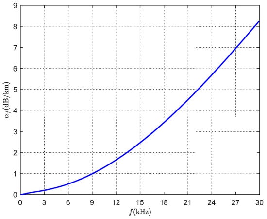 Figure 2 shows the relationship of αf with the variable frequency f. According to [31,32], most acoustic systems operate in the 0–30 kHz frequency band. In addition, it deserves to be noted that a standard terrestrial localization using RSS measurements can be obtained while αf equals to 0.
