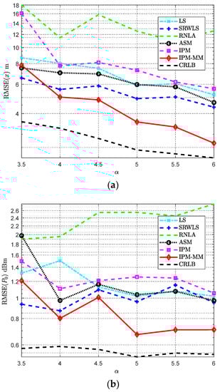 The RMSE versus varying path loss exponent α is illustrated in Figure 4. The specific parameters are set in Table 1. It is worth mentioning that some unlisted parameters remain the same as before. Interestingly, RNLA seems more sensitive than others. It can be observed that almost all methods have acquired the relatively acceptable robustness with increasing α except RNLA, in which IPM-MM outperforms the others for most cases. It may be less satisfactory for the performance of the estimate of x and P0 when α = 3.5, however, with the increase of α, our method shows a better performance than the rest. For the single IPM, without MMT, it is less ideal compared with IPM-MM according to the simulation results, its performance is just better than RLNA when α ∈ [3.5, 6] shown in Figure 4a, and similarly in Figure 4b, it may not perform well among all methods, but when α = 4, its performance of estimating P0 is at a moderate level.