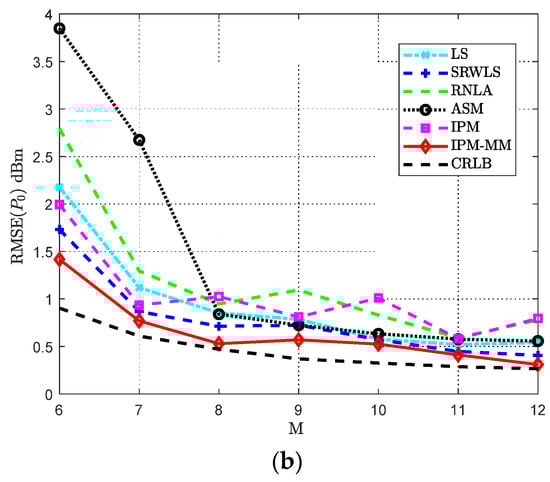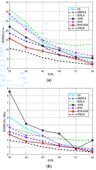 Figure 5 depicts the RMSE of different methods with growing . It is noteworthy that unless otherwise stated, all fixed parameters are the same as before. Other parameter settings are shown in Table 2. Obviously, the performance of all methods is improved when the size of SNR increases. Compared with LS, SRWLS, ASM, RNLA, our IPM-MM is closer to CRLB. Especially when SNR is 54 dB, our method performs better than others for both estimating x (shown in Figure 5a) and P0 (shown in Figure 5b). In addition, the performance gap between IPM and IPM-MM seems a little bit big, IPM-MM performs better than IPM, which demonstrates the combination is effective. Although when SNR = 51 dB, it may not evident in Figure 5b, yet it is apparent in Figure 5a. Overall, other schemes are not as good as our method in the estimation of , and are not as close to CRLB as our scheme for estimating P0.
