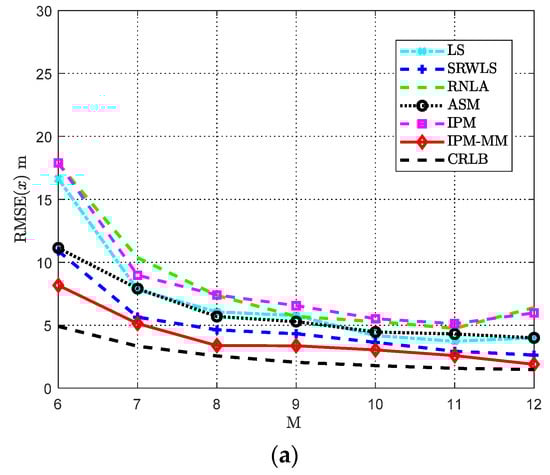 From Figure 6, when the anchor’s number is on the rise, among all the methods, our proposed IPM-MM obtains a relatively satisfactory performance, in which the results are closer to the CRLB compared to others. Especially when the anchor number M = 8 or 12, its outperformance is remarkable. IPM may seem less robust than others under current conditions, but adding MMT surpasses the other methods and gets a perfect improvement.