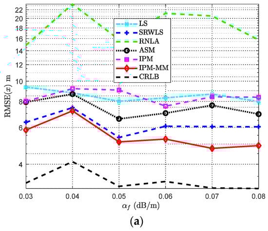 Absorption bias plays an important role in Equation (3). It is necessary to discuss the relationship between the RMSE and absorption coefficient αf, which is displayed in Figure 7. Apart from some previously fixed parameters, other parameters are displayed in Table 4. Obviously, RNLA seems more sensitive to αf than others, and αf has a great influence on each scheme. Nevertheless, we observe that our solution acquires the relatively acceptable robustness among all the schemes and is still optimal to target location estimation. Figure 7b, in which IPM-MM outperforms the others for all cases. For the single IPM, without MMT, it is not ideal compared with IPM-MM according to the simulation results; its performance is just at a moderate level among all methods. With the increase of αf, our improvements on the basis of IPM could be more visible.