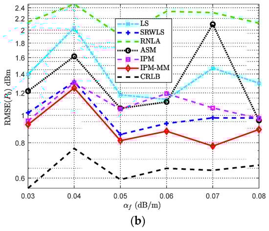 RMSE comparisons: (a) The RMSE of x versus varying ; (b) The RMSE of P0 versus varying . Both with, = 4, = 0.04 dB/m, Sel = 100, and anchors M = 7.