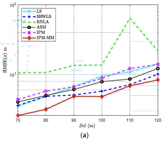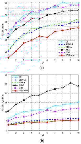 Figure 10 depicts the RMSE of various methods with growing . The noise parameter range is set from 1 to 10. The relevant parameters are displayed in Table 7. Intuitively, with the increase of , the overall performance shows a downward trend. Compared with LS, SRWLS, ASM, RNLA, our IPM-MM has a lower RMSE especially estimating . Although in Figure 10b, our proposed method has no obvious advantages compared with SRWLS and RNLA, our scheme is more accurate for the position estimation. In addition, IPM-MM always presents a better performance for the estimate of and than IPM. Besides, we find that the performance gap between SRWLS and RNLA is small; it occurs because both two converted the location problem into a GTRS. Generally, to ensure good performance in a noisy environment, our method provides the best choice of all.