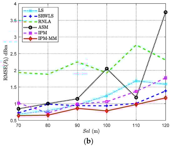 RMSE comparisons: (a) The RMSE of versus varying Sel; (b) The RMSE of P0 versus varying Sel. Both with anchors M = 7, = 4, = 0.04 dB/m, and SNR = 50 dB.
