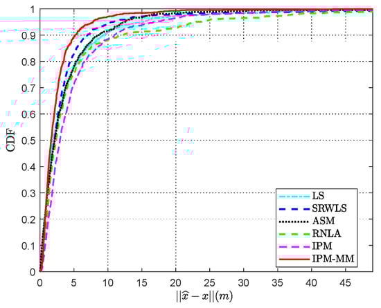 Figure 9 indicates the cumulative distribution function (CDF) of various methods versus when = 0.04 dB/m. The other parameter settings are shown in Table 6. It is obvious that our proposed method obtains the best performance. When CDF reaches almost 90%, the error of our IPM-MM is 5.20 m, whereas the errors of SRWLS, ASM, LS, IPM, RNLA are 7.05, 8.70, 9.25, 10.94 and 12.01 m, respectively. According to the numerical results, we find that IPM combined with the majorization-minimization strategy brings better improvement than the single IPM and realize 52.5% performance improvement.