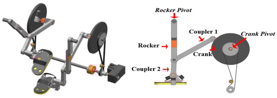 This machine of gait training and rehabilitation consists of a left and right side, stride control section, five section link, and footstep section. A flywheel is used for continuous drive. When the stance phase from heel-strike to toe-off of walking is performed, a swing on the opposite side occurs simultaneously. The five-bar link consisting of a crank, rocker, and coupler 1 and 2 is designed to construct the gait trajectory of the foot by adjusting the link length of the link connected to the end of coupler 2 by rotating the crank (Figure 1). The footplate manually touches the treadmill and bottom to allow the belt to rotate.