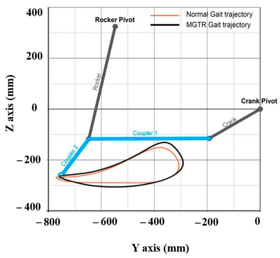 In order to implement the trajectory of the foot during walking, the movement design of the five-bar linkage mechanism is mathematically written as Equation (1). The length ratio and drive joint spacing are considered when designing the five-bar link. To reduce the mechanical singularity, the RoM (range of motion) should be determined be setting the applicable link ratio and drive joint spacing. The RoM is a pattern of gait trajectories from the foot [8]. In this study, the position trajectory of the ankle was measured during walking with a 3D motion analysis system composed of infrared cameras and was mathematically modeled using a Fourier function (Equation (1) and Table 1). The mechanism was designed using the cost function to minimize the error of the trajectory (Gi) of the modeled ankle and the trajectory (Ti) of the five-bar linkage mechanism. The angle between coupler 1 and 2, the length of each link, and the position P(x, y) of the rocker pivot were set as design variables (Equation (1)). According to Equations (1) and (2), the foot trajectory during walking is presented in coupler 2, which is caused by the pivot of the rocker and crank (Figure 2).