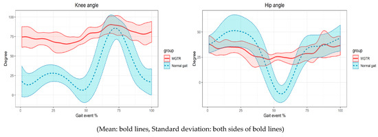 The maximum and minimum angles and the RoM of each subject were extracted. It was compared statistically to determine the motion differences between the normal gait and MGTR. There was a significant difference in the minimum angle, maximum angle, and joint motion range (RoM) in the hip joint (Table 2).