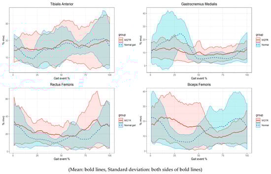 The BF is activated before and after the heel contact event of the gait. In this study, the activation level was similar; however, there was a difference at the maximum timing. The maximum activities were 31% and 29%, and the timings were 61% and 41% of the normal gait and MGTR, respectively.