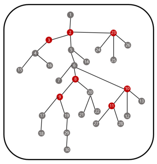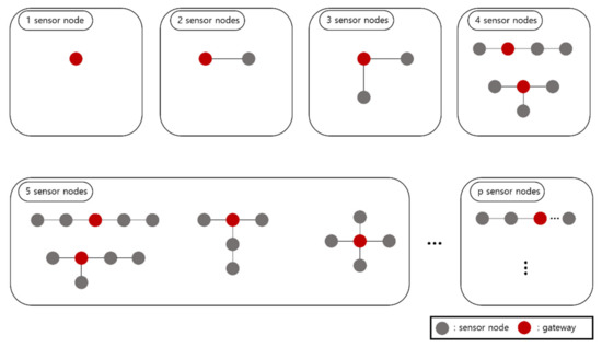 In Figure 1, in the case of one sensor node, it is only the case that the corresponding sensor node is set as a gateway. In the case of two sensor nodes, there is only one topology, and there is no difference in cost when either of them is designated as a gateway. In the case of three sensor nodes, the topology is one, and it is optimal that the sensor node at the center is designated as a gateway. In the case of 4 sensor nodes, there are two topology cases, and the ideal location of the gateway for each topology is marked with red in Figure 1. In the case of 5 sensor nodes, the number of topology cases is 4, and the optimal gateway designation position for each topology is also marked with a red gateway. As above, all topology cases from 1 to p sensor nodes and the optimal gateway location for each case can be found and stored in the cost reference.