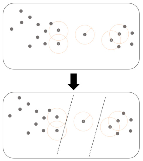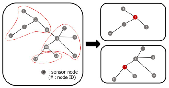 Figure 2 shows the methodology before and after going through the first step. The gray points represent the sensor nodes. In Figure 2, the orange dotted circles indicate the communication range of the corresponding sensor nodes. Sensors 1 and 2 cannot communicate with sensor 3. Therefore, sensor 3 must be set as a gateway for the connection constraint. With this motivation, in the first step, the network is divided into several subgraphs so that nodes within a communication range are defined as a group. For example, in Figure 2, it is divided into three groups: a group containing sensors 1 and 2, a group containing sensor 3, and a group containing sensors 4 and 5.