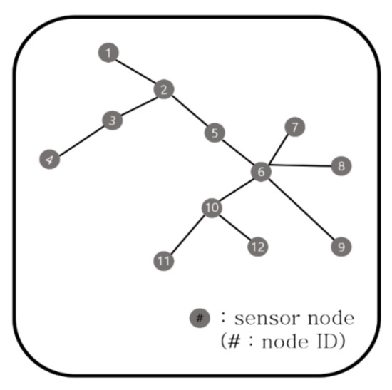 Wireless sensor networks (WSNs) consist of sensor nodes and sinks. The sensor nodes detect physical phenomena and transmit all collected data to a gateway called a sink in a multi-hop manner according to a designated routing protocol [1]. These WSNs are used in many areas. For example, collecting and transmitting data by applying internet of things (IoT) technology makes it easier to manage the power transmission system located in a dangerous terrain [2]. In addition, sensor networks are applied in various areas, including human health monitoring [3], home IoT [4], smart factories [5], environmental and weather information measurement [6], stability measurement of buildings [7,8], and control of various smart devices [9].