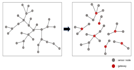 The entire topology can be divided into several subgraphs centered on each gateway. The total cost for the entire topology is the same as the sum of the subgroup costs, since only one gateway will be assigned for each sensor node. Thus, if our partitioning is proper and we find a deployment for the minimum cost in each subgraph, then we can obtain the total minimum cost for the entire topology. This method has the advantage of shortening the computation time. Finding the optimal placement for the whole network takes a lot of time, but repeatedly finding the optimal placement for the subgraphs does not take much time. However, if it is not properly divided into subgroups, there may be a lot of differences from the ideal optimal cost. Therefore, we need to divide the groups appropriately to obtain a deployment close to the ideal optimal cost in a short time.
