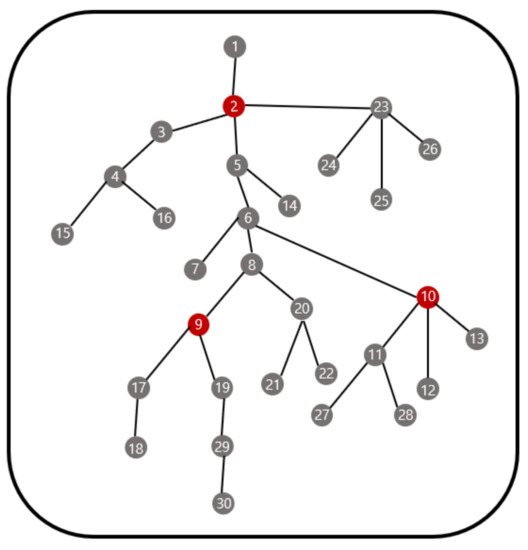 For example, Figure 3 shows the topology of the leftmost group after the first step in Figure 2. It consists of a total of 12 sensor nodes. When the maximum sensor node of each combination is p = 9 and the maximum number of gateway arrangements is q = 5, there are several cases in which 12 sensor nodes are divided. The smallest unit can be a combination of 12 groups with one sensor node, such as: