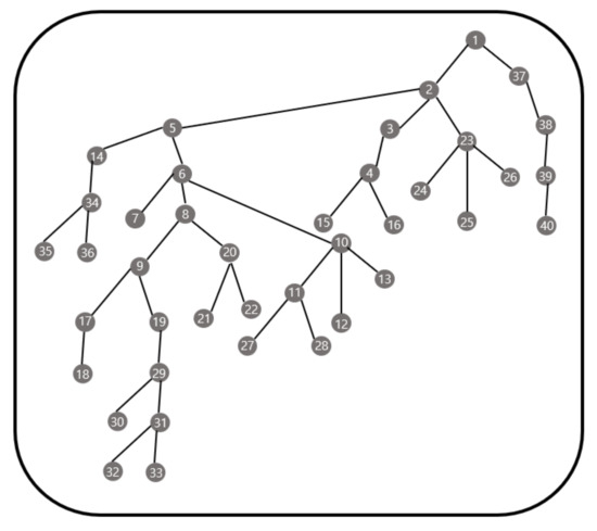 We additionally provide a comparison of the genetic algorithm and our methodology for the 40 nodes topology in Figure 14. See Figure 15 for the comparison. We also set the crossover probability = 0.8, the mutation probability = 0.006, and the iteration number = 100 and we increase the number of pools as 5, 10, 20, 30 with the same cost function as in the previous case. The experiment was executed five times for each pool, and Figure 15 is based on the average value of five executions. For the genetic algorithm, when the number of the pools is small, the result may be limited because the result is produced by sampling from the pool. Therefore, we cannot obtain the lowest cost case. As the number of pools increases, the cost decreases, but the computation time increases. Because the combination of samples increases. On the contrary, the outcome of the proposed method is consistent.