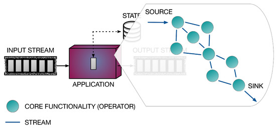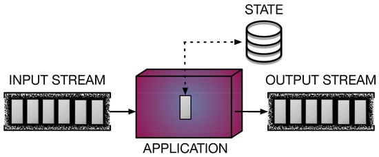 Stream processing application. Stream elements are represented in grey. The application receives a stream in input and performs some computation on each received item, producing a stream of results in output. Operators can be stateless or stateful, in case they maintain a state containing information on the data processed so far.