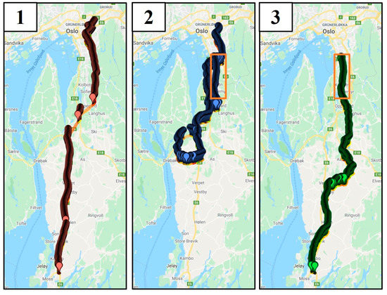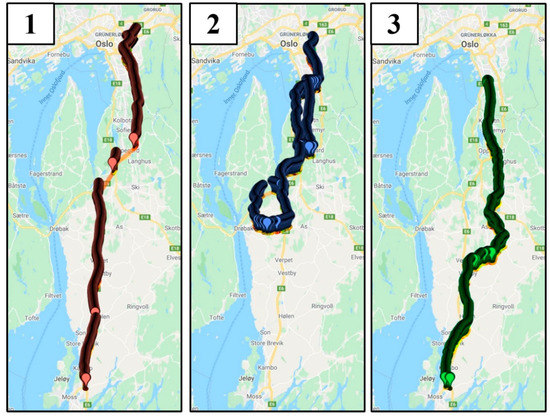 Routes driven: (1) freeway route for both day and night cases, (2) county roads daytime route, (3) county road night-time route. Visualization: http://geojsonviewer.nsspot.net/ (accessed on 20 February 2021).