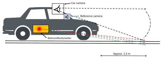 The Laserlux retroreflectometer can only measure road markings on one side of the car at a time. Zwahlen and Schnell [37] found in their research that the distance at which humans can see road markings is mainly governed by the visibility of the right edge line in the case of a fully marked road. The retroreflectometer was therefore attached to the right side of the car with respect to the driving direction, and the car was driven in the rightmost lane throughout the test, thus detecting the fog line. The retroreflectometer’s laser beams hit the road at approximately 1.5 m in front of the car on the fog line (Figure 2).