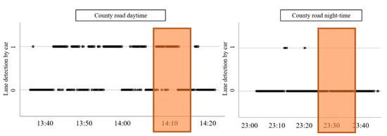 In the table, 0 indicates that no lane marking was detected, while 1 indicates that the road marking was found. Table 3 shows that the outcome of the lane detection’s functionality was correctly predicted by the model in 92.1% of cases for the freeway and 92.8% of cases for county roads in the daytime. Regarding night-time, the results were 93.1% for the freeway and 98.1% for county roads. There was a higher accuracy level for no detection of lane markings on the freeway in both daytime and night-time. The same was true for the county roads at night-time, although the difference was not as distinct. With respect to the county road daytime case, the accuracy was similar between no marking detected and a marking found. There was a considerable difference between the freeway and county roads in the share of cases concerning where markings were detected versus where they were not. The county roads had higher rates of unmarked roads than the freeway. This was expected because of the county roads’ lower maintenance level.