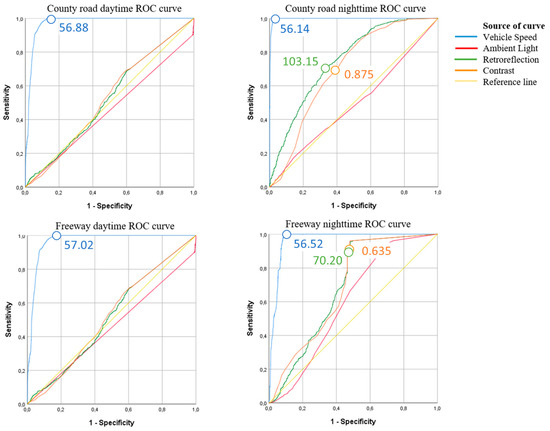 Figure 6 shows that with respect to daytime driving, Retroreflection and Contrast also seemed to have little predictive quality. Under night-time conditions, the AUC is larger for these two variables, and within these two cases, the curves for the county road are the best in terms of establishing a threshold cut-off. Resulting in a high level of sensitivity and relatively low value for 1-specificity.
