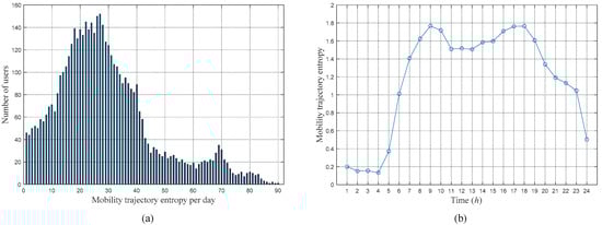 Using the above method, the MTEs of all users are calculated using MATLAB R2016a, and the statistical result is shown in Figure 1. Figure 1a shows the average daily MTE distribution of all users. It is observed that the daily MTEs of most users are relatively small and are mainly concentrated between 1 and 50. These users account for approximately 87.42% of the total number of users. This percentage shows that most users usually have relatively small ranges of activity and relatively simple movement trajectories. However, a small number of users have high mobile entropy, up to approximately 90. This value indicates that there are no regular patterns in the movements of these users and that their trajectories are relatively complicated. Figure 1b shows the average MTE of all users in different time periods within a day. It is observed that the distribution of user MTE per hour is similar to that of the user’s daily mobility. The peaks are concentrated in the morning and evening rush hours. This concentration shows that there is a positive correlation between the user’s movement intensity and the trajectory complexity.