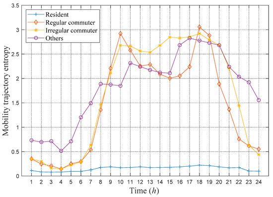 To further verify the classification effect and understand the complexity of the movement trajectory of various types of users, the average MTEs in every hour of the four types of users are calculated using the method introduced in the previous chapter. The results are shown in Figure 2. It is observed that there are obvious differences in the mobility behavior of various types of users. Residents have lower MTE throughout the day, indicating that these users rarely move throughout the day. The MTE value of regular commuters presents a distinct double-peak characteristic, which indicates that these users commute to work on time every day, and they move very little during working hours. The MTE value of irregular commuters shows that their trajectories are more complicated in the daytime, and there will be more movements during working hours. Compared to the other three types of users, the category of others has higher entropy values at night, indicating that they move more frequently at night. The obvious differences in mobile features between each type of user also verify the rationality of the classification criteria and the effectiveness of the classification algorithm.
