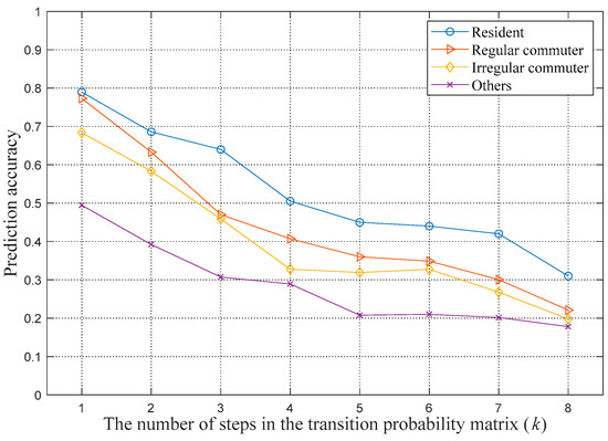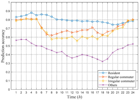 In addition, Figure 6 shows the distribution of the weighted Markov prediction accuracy for each type of user against different times of the day. Figure 6 shows that the prediction accuracy has a negative correlation with user mobility. Residents have the lowest mobility, so their prediction accuracy is the highest. For regular commuters, their prediction accuracy during the morning and evening peak periods is relatively low. For irregular commuters, the accuracy of their working hours during the day is relatively low. The prediction accuracy of the category of others is very low overall. Even during the night, the category of others is still much lower than other types of users. These are due to that higher mobility resulting in more states in the Markov transition matrix, which scatter the influence of historical trajectories on the prediction of the next location. For example, for a user category that includes couriers or truck drivers, the nature of their work leads to irregular mobility, which makes the next location almost impossible to predict. Therefore, the more the user moves, the higher the uncertainty in the user mobility, which leads to a lower prediction accuracy.