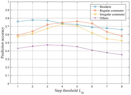 In addition, to determine the optimal number of steps, this paper selects 50 users in each classification and calculates the prediction accuracy under different numbers of steps. The results are shown in Figure 4. It is observed that with the increase in the number of steps, the prediction accuracies of various types of users will first increase and then decrease. This observation shows that the first few locations before the prediction moment will have more important effects on the prediction. Moreover, for different types of users, the peak value of prediction accuracy appears at different steps. The variation in the prediction accuracy of residents is minimal, and the peak value of accuracy appears at a step threshold of 2. The regular and irregular commuters have similar trends in prediction accuracy, with peaks at step thresholds of 5 and 4, respectively. The peak value of the prediction accuracy of others appears at a step threshold of 3.