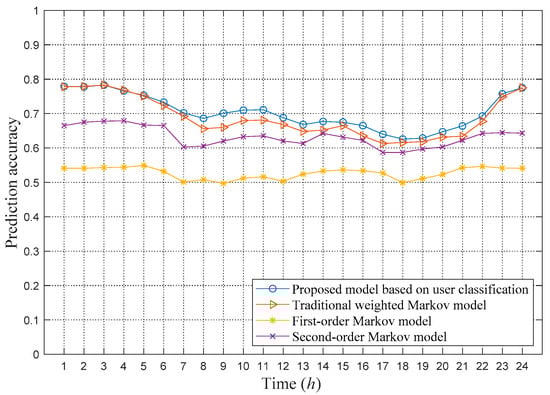 Based on the optimal step threshold and weighting coefficients determined in the previous section, the weighted Markov model is used to predict the next location of four types of users, and the prediction accuracy is calculated in units of one hour. The prediction accuracy of the weighted Markov model based on different user types proposed in this paper is compared with the prediction accuracy of traditional weighted Markov models and first- and second-order Markov prediction models. Among them, the traditional weighted Markov model does not perform classification processing for all users. The highest order of the traditional Markov model is set to 4, and the weighting coefficients are calculated in a decreasing manner as given in Equation (13). In the second-order Markov model, the effect of the two locations before the current location on the transition probability is considered. The test results are shown in Figure 5.