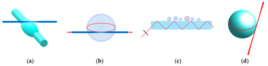 Different types of WGM humidity sensors: (a) Microbottle coupled by tapered fiber; (b) Microsphere coated with humidity-sensitive layer coupled by tapered fiber; (c) Many microspheres coupled by a prism; (d) Humidity sensitive liquid droplet resonator coupled by a free space beam.