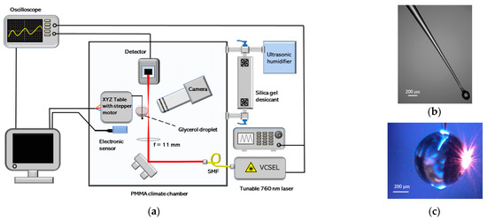 (a) Experimental set-up for humidity measurements. After entering the climate chamber, light is reflected from the mirror. The converging lens focuses the light on the side of the glycerol droplet. Photodiode collects WGM transmission spectrum and sends data to the oscilloscope that is operated in AC coupling mode. The electronic humidity sensor for control measurements is positioned a few centimeters away from the droplet; (b) Fine tapered fiber with a melted tip to support the droplet; (c) Glycerol microsphere created with dipping method. The laser beam was focused on the side of the glycerol droplet to excite the WGM resonances.
