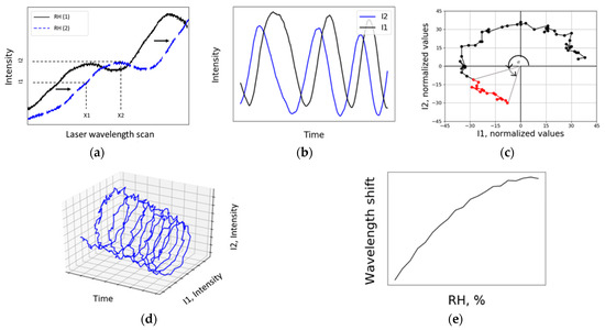 To analyze the above data (Figure 3a), the waveform from the oscilloscope was collected three times per second. The oscilloscope’s X-axis consists of 4000 data points. To determine if the humidity increased or decreased (modes shifted to the right or left accordingly), our developed method used the recorded intensity at points X1 and X2 (Figure 4a). Points were chosen so that one of them would be at a local minimum (analogous to sin(0)) and the other would have a phase difference of π/2. As a result, by plotting the values of X1 and X2 (values change in time as RH changes), two sinusoidal graphs were obtained (Figure 4b). To process the data, an original Python program was created. Using the two sinusoidal graphs, the Lissajous figure was plotted (Figure 4d) [35] and normalized based on the amount of light the detector received (Figure 4c). Without the normalized intensity values I1 and I2, the obtained Lissajous figure would form an impractical spiral. The angular shift in Lissajous figure represents the shift in resonant wavelength (Figure 4e). A shift of 360° equals a shift of one free spectral range (FSR). The developed method does not require very high Q factors for detecting the wavelength shift as it does not follow one peak. However, this method can be used efficiently only when the resonance half width at half maximum is similar to the half of FSR. Peaks should create smooth and sinusoidal-like curve.