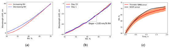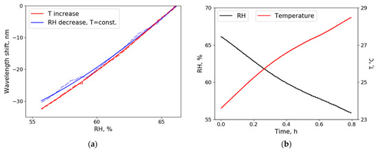 RH depends on both the amount of water vapor in the air and the temperature; therefore, RH can be controlled by manipulating one of these parameters. If the material used for sensing is temperature independent, wavelength shift (due to RH change) should be the same no matter how it is enforced. Figure 6a shows wavelength shift due to RH change enforced by reducing water vapor (blue curve) and by increasing temperature in the chamber (red curve). The difference between the two curves is caused partially due to the inaccuracy of the electric sensor used for control measurements and partially due to the small radius and refractive index changes created by temperature increase. Figure 6b shows the dependency of temperature and humidity in the climate chamber when the temperature was slowly increased (see Section 3; absolute humidity is constant, relative humidity changes due to the temperature change), and in this way, the red curve in Figure 6a was obtained. Such an experiment indicates that our proposed sensor is sensitive to relative humidity because absolute humidity was not changed while enforcing RH change only by temperature increase. When comparing Figure 6a,b, it can be seen that small temperature fluctuations by approximately 3 °C did not cause any additional wavelength shift (curves coincide), and larger temperature changes caused small wavelength shifts.